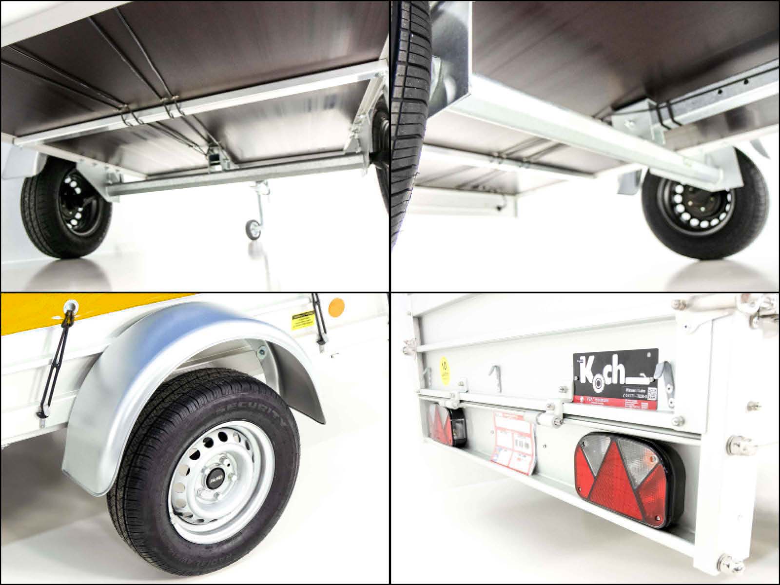 Der Anhänger ist ungebremst, was ihn für leichtere Transportaufgaben besonders geeignet macht. Außerdem bietet der Anhänger eine rutschfeste Siebdruckbodenplatte und eine abnehmbare Heckklappe.