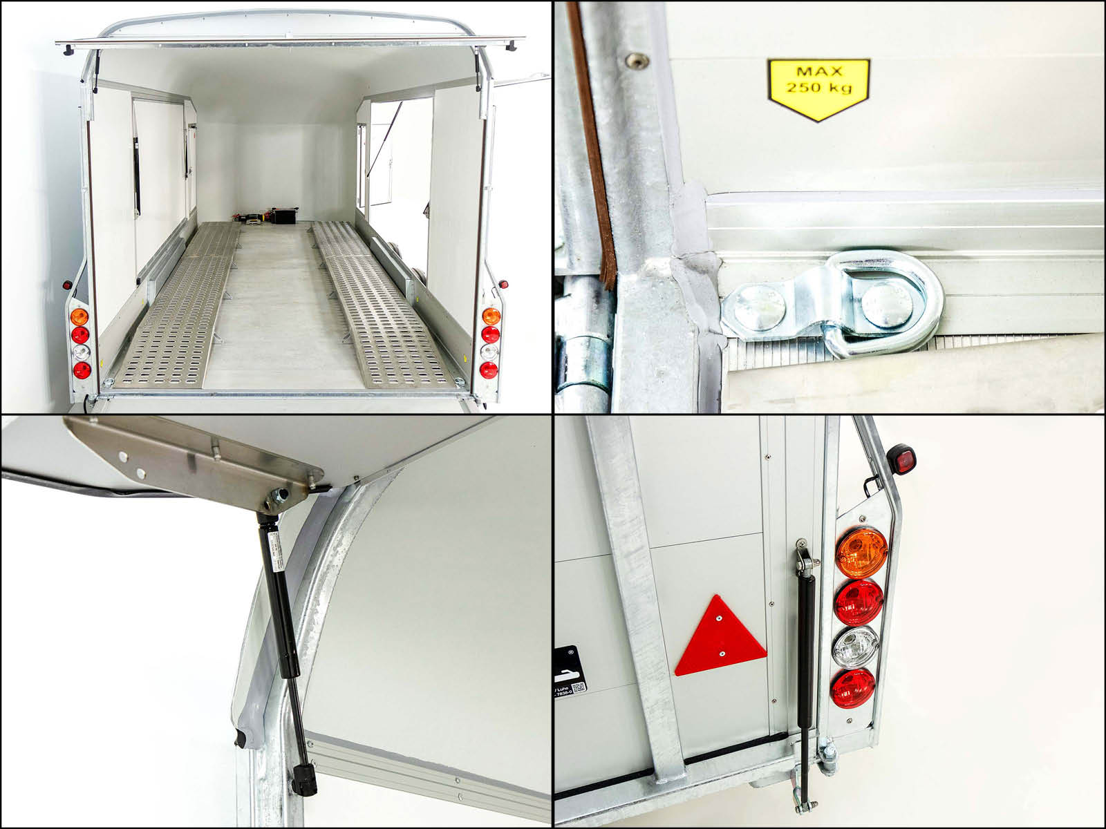 - 2 x Seitenklappen mit hydraulischen Dämpfern, abschließbar