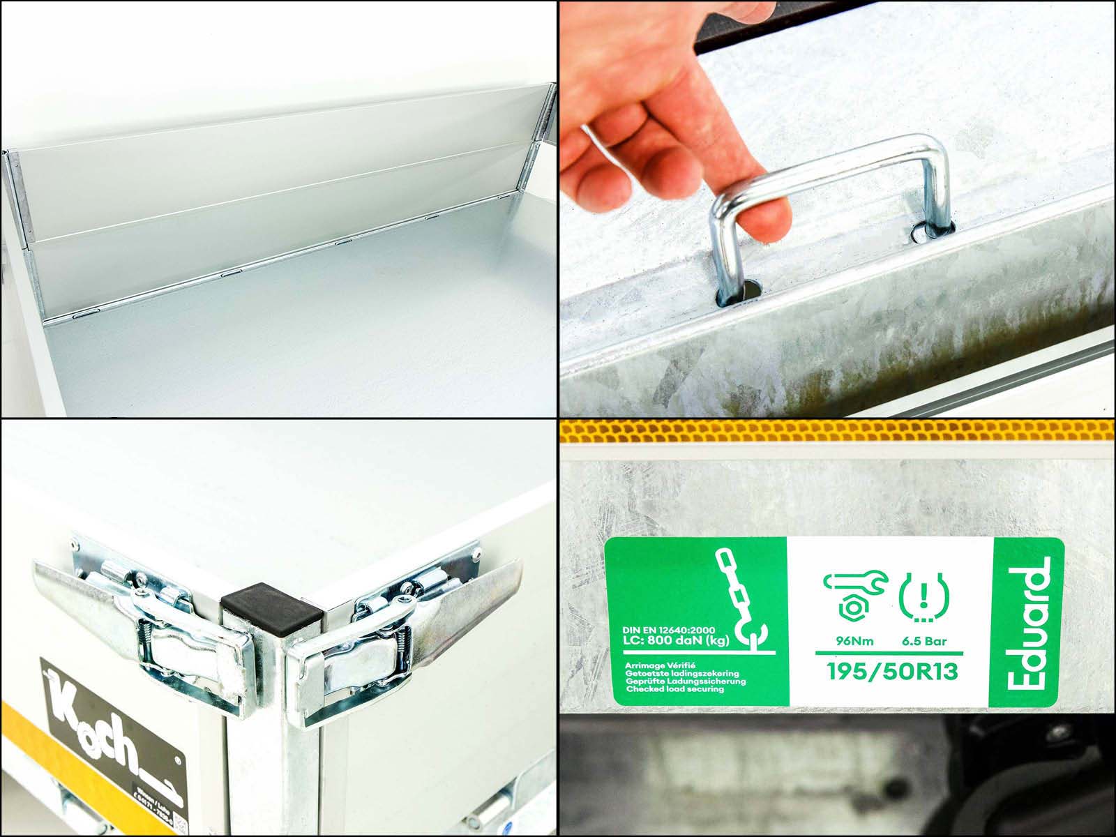Der Eduard Heckkipper in dieser Version bietet eine hervorragende Kombination aus einer E-Hydraulikpumpe und einer Handpumpe. Mit einem robusten Aluminium-Bordwandaufsatz von 30 cm und einer maximalen Nutzlast von 1.454 kg, eignet sich dieser Kipper bestens für den Transport von schwereren Materialien.