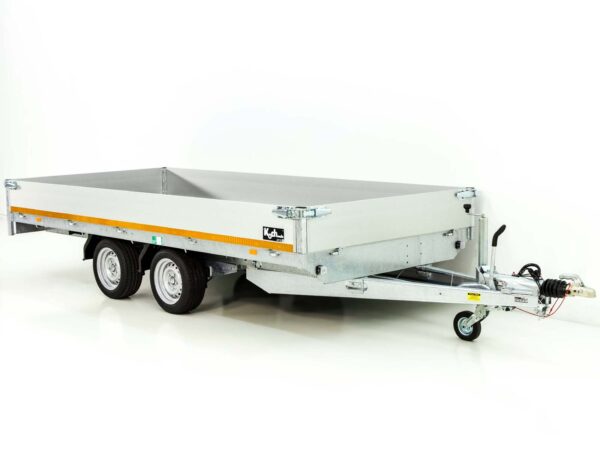 Der Eduard Hochlader Anhänger 4018 GD ist ein robuster Anhänger mit einem Lademaß von 180×406 cm und einer Nutzlast von 2911 kg bei einem zulässigen Gesamtgewicht von 3500 kg. Er eignet sich hervorragend für größere Lasten und vielseitige Transportbedürfnisse. Der Anhänger ist mit einer rutschhemmenden Siebdruckplatte ausgestattet, die für sicheren Halt sorgt. Die Bordwände aus Aluminium sind klapp- und abnehmbar, und es gibt insgesamt 16 Zurrösen zur optimalen Ladungssicherung. Der Anhänger hat ein Automatik-Stützrad und eine Rückfahrautomatik für einfaches Handling.