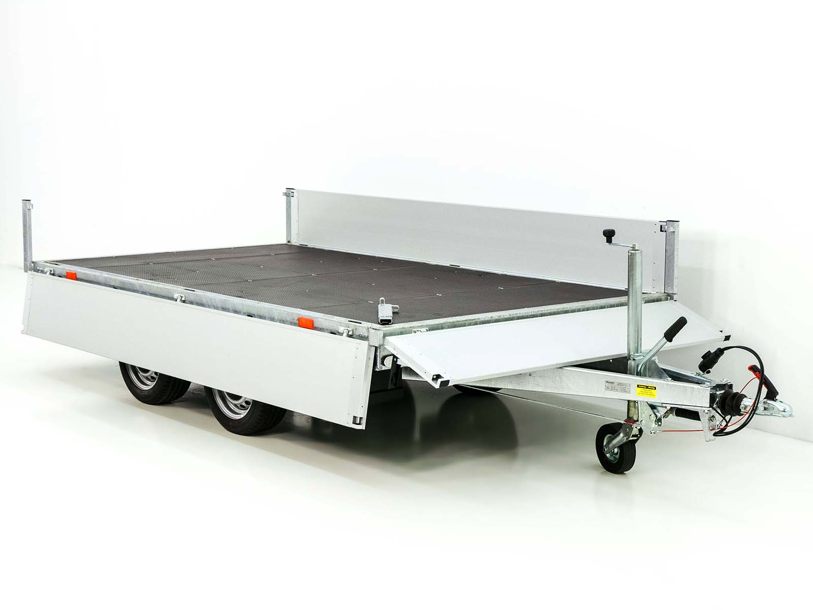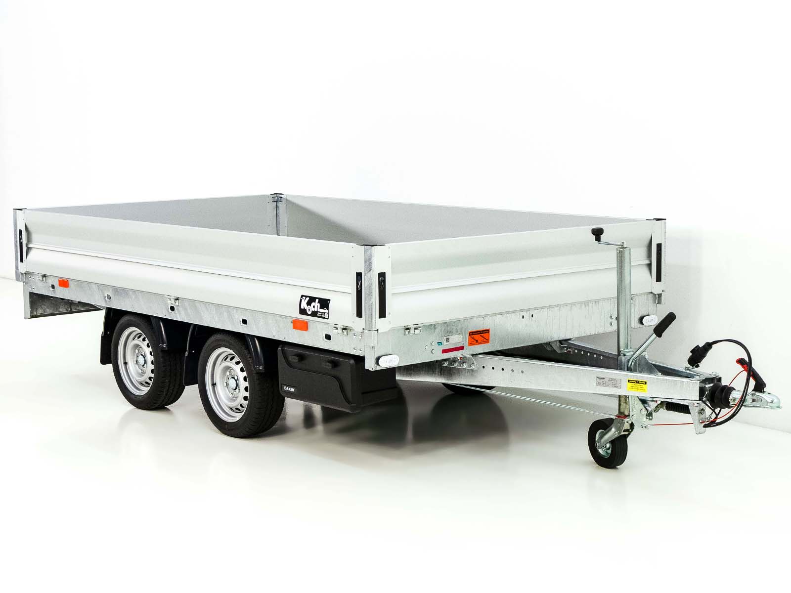 Der Vezeko Hochlader Anhänger D27.3 ist ein stabiler Anhänger mit einer großzügigen Ladefläche von 182 x 317 cm und einem zulässigen Gesamtgewicht von 2,7 Tonnen. Er bietet eine hohe Nutzlast von 2200 kg und eignet sich hervorragend für mittelgroße bis schwere Transporte. Der Anhänger ist mit einer Multiplex-Holzbodenplatte ausgestattet, die für hohe Belastung und Haltbarkeit sorgt. Außerdem sind die Bordwände aus Aluminium (350 mm hoch) klapp- und abnehmbar, was vielseitige Transportmöglichkeiten bietet. Das Fahrzeug verfügt über 6 Zurrbügel für die Ladungssicherung und eine Staubox unter der Ladefläche für zusätzlichen Stauraum. Optional kann eine 100 km/h Zulassung erworben werden.
