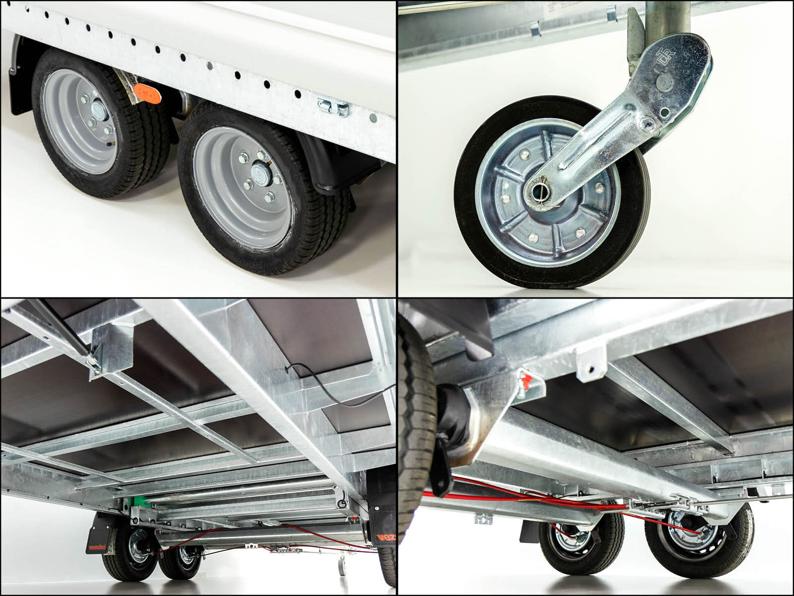 Der Vezeko Hochlader Anhänger J30.43 mit Laderaummaßen von 210×430 cm bietet eine Nutzlast von ca. 2195 kg und ist mit einer kippbaren Ladefläche ausgestattet, die eine Neigung von 13,5° bietet und über eine manuelle Pumpe funktioniert. Der Anhänger hat 8 Zurrbügel im Bodenrahmenprofil für eine sichere Ladungssicherung. Er verfügt über eine durchgehende Rampe und eignet sich besonders für den Transport von Fahrzeugen und anderen schweren Geräten. Der Automatik-Stützrad und die Rückfahrautomatik bieten zusätzliche Komfortfunktionen.
